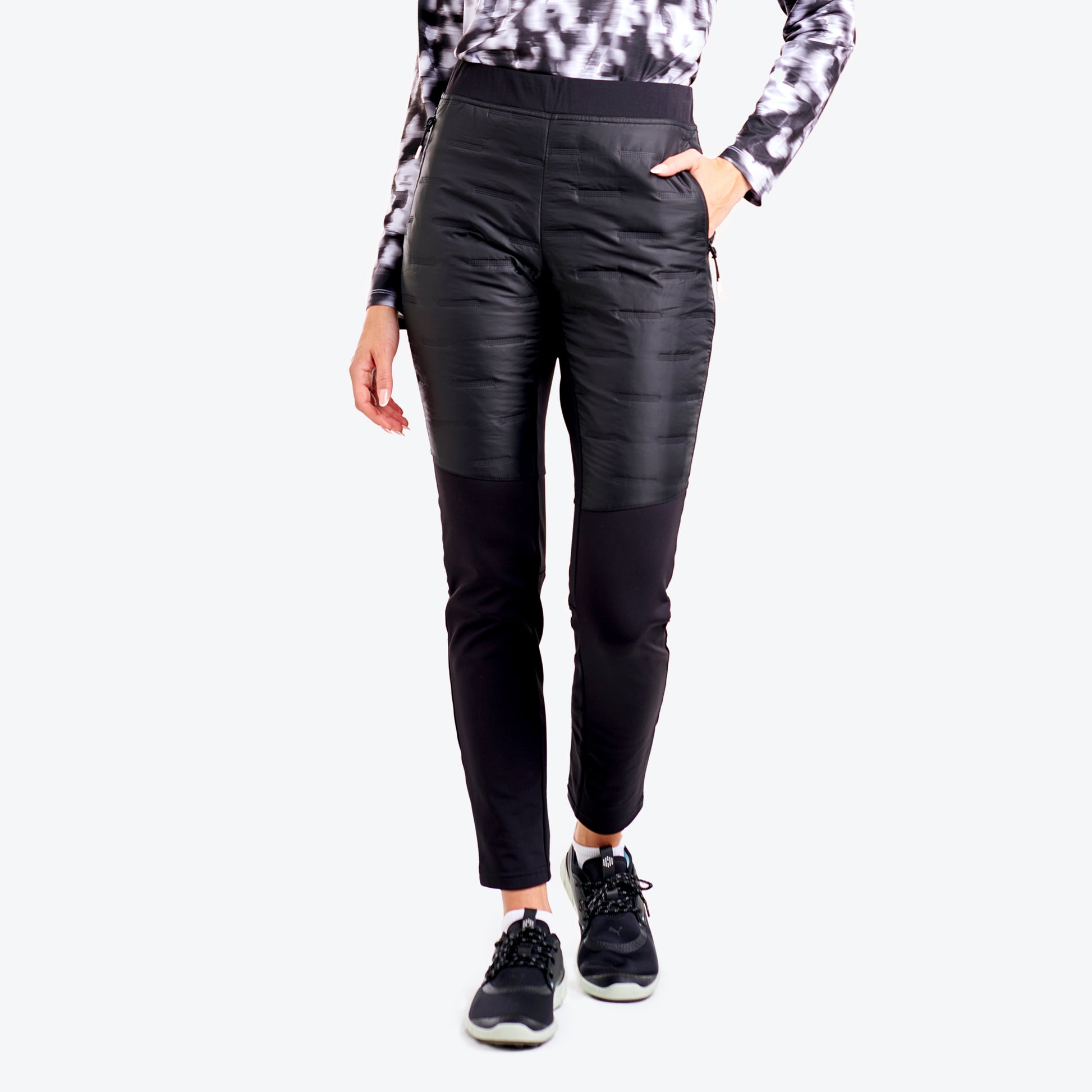 These fitted pull-on pants combine comfort and performance, perfect for your days on the course. Featuring ultrasonic dot and stripe quilting, the Demi pants add a unique style while ensuring maximum freedom of movement. The elastic waistband and zipper pockets provide a secure fit and ultimate practicality. In addition to its modern design, these golf pants for women offers UV protection, quick-dry, and moisture-wicking features to keep you comfortable throughout your game. A perfect choice for discerning golfers!