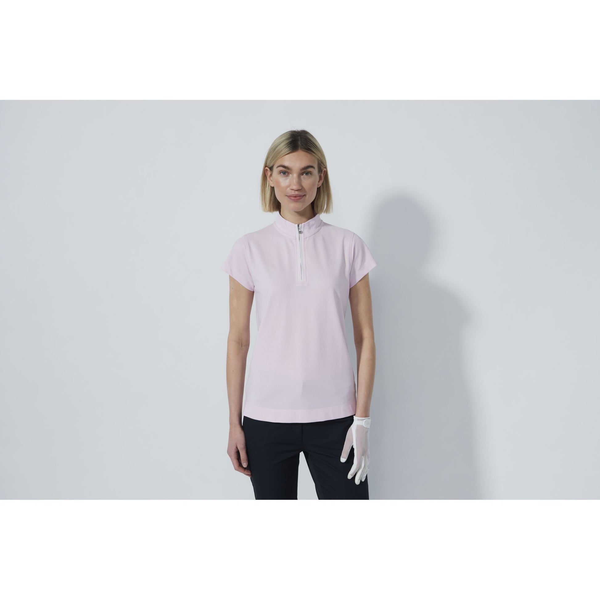 Short sleeve 13 cm , Stretchy pique , Quick Dry material Moisture transportation , Stand-up collar , Striped placket with zip , Side slits , Embroidered logo at sleeve