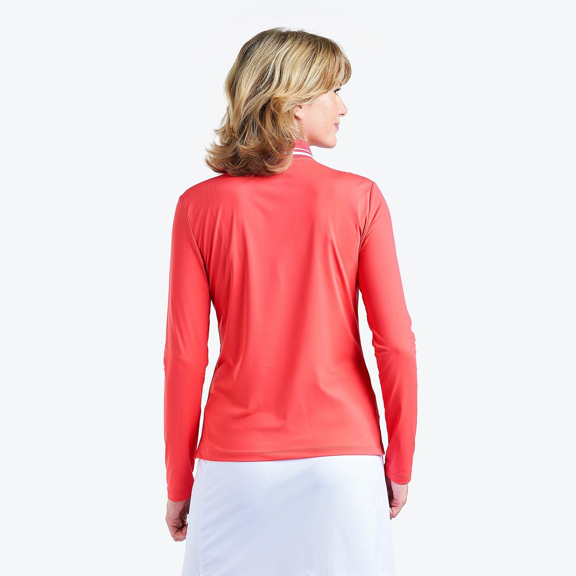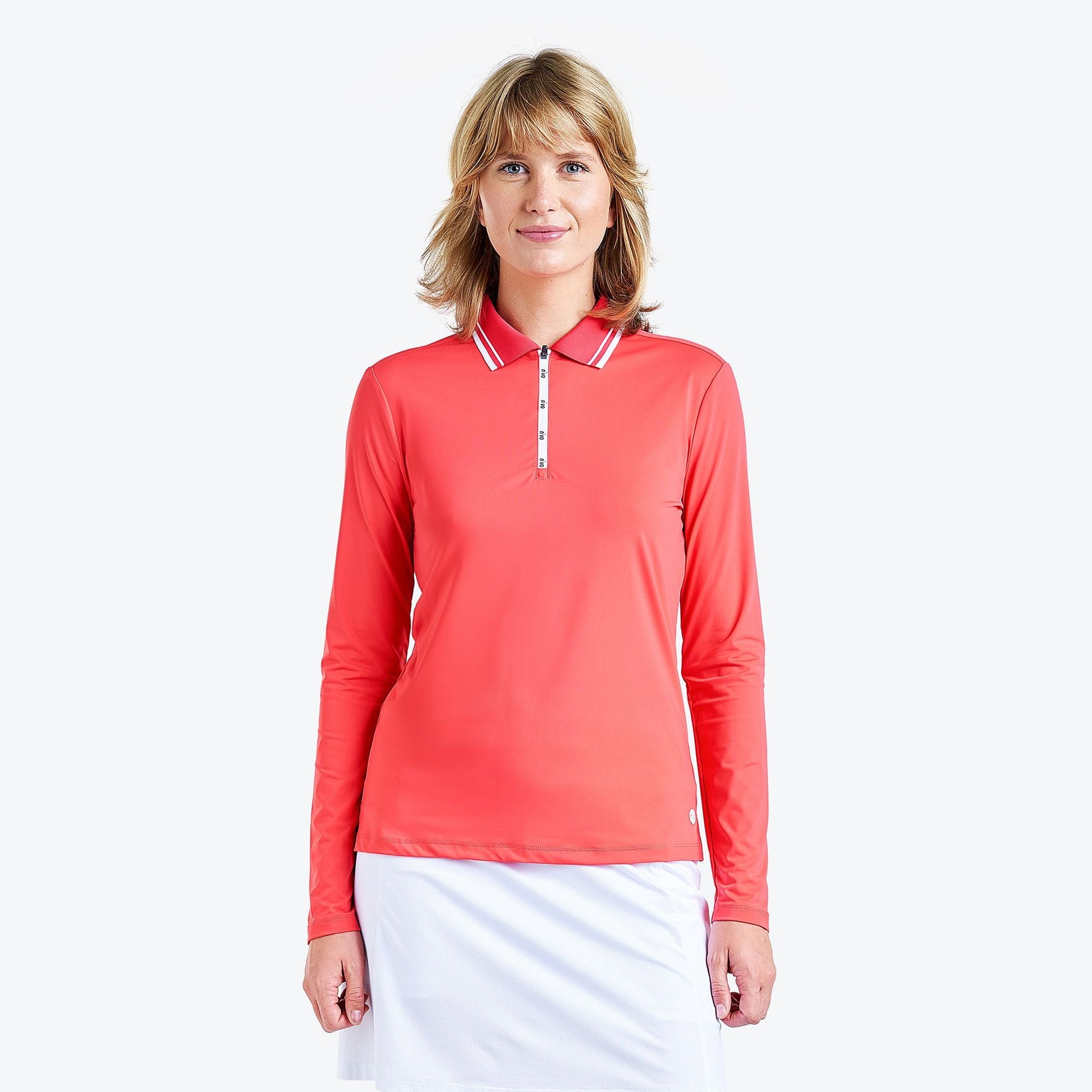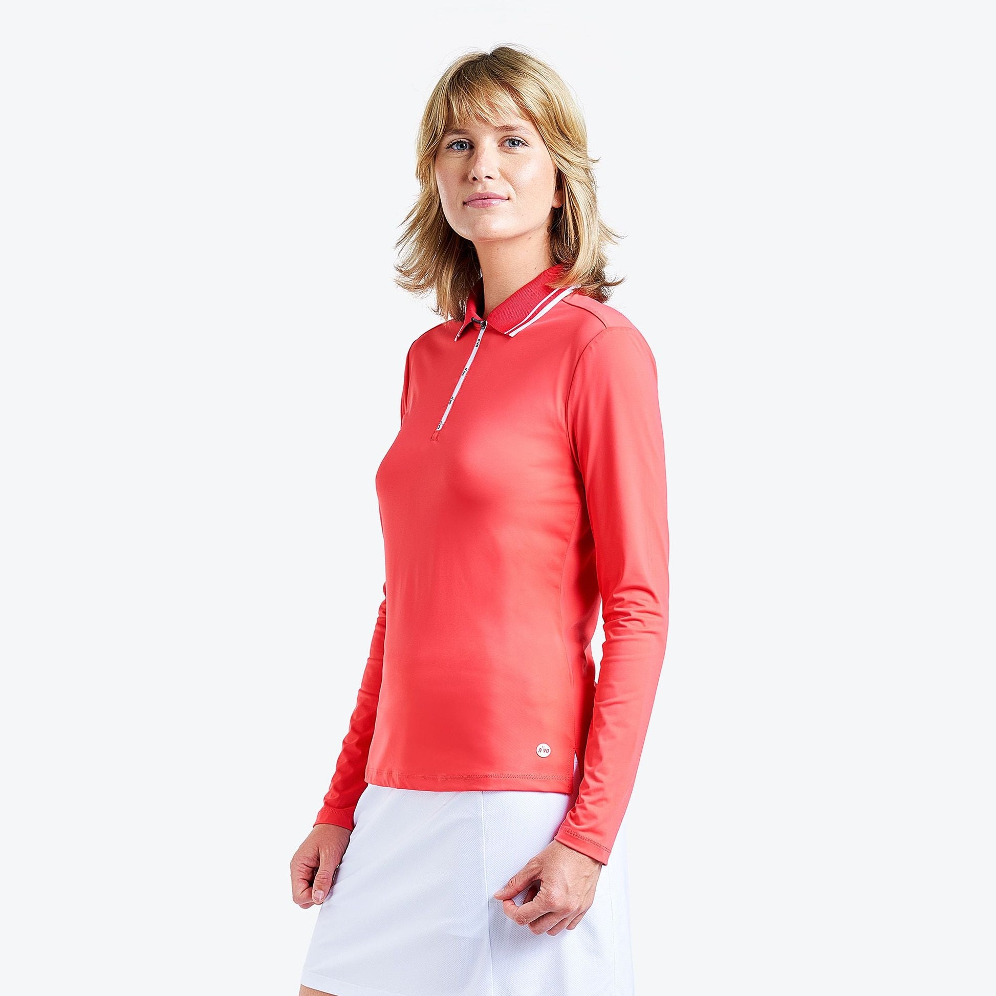 "The Alana polo shirt from NVO boasts stretchiness and a soft feel, thanks to its jersey fabric, ensuring exceptional comfort. This golf polo, with its long sleeves, keeps you warm while facilitating air circulation, providing a fresh feel through its cooling, moisture-wicking, and quick-drying properties.
