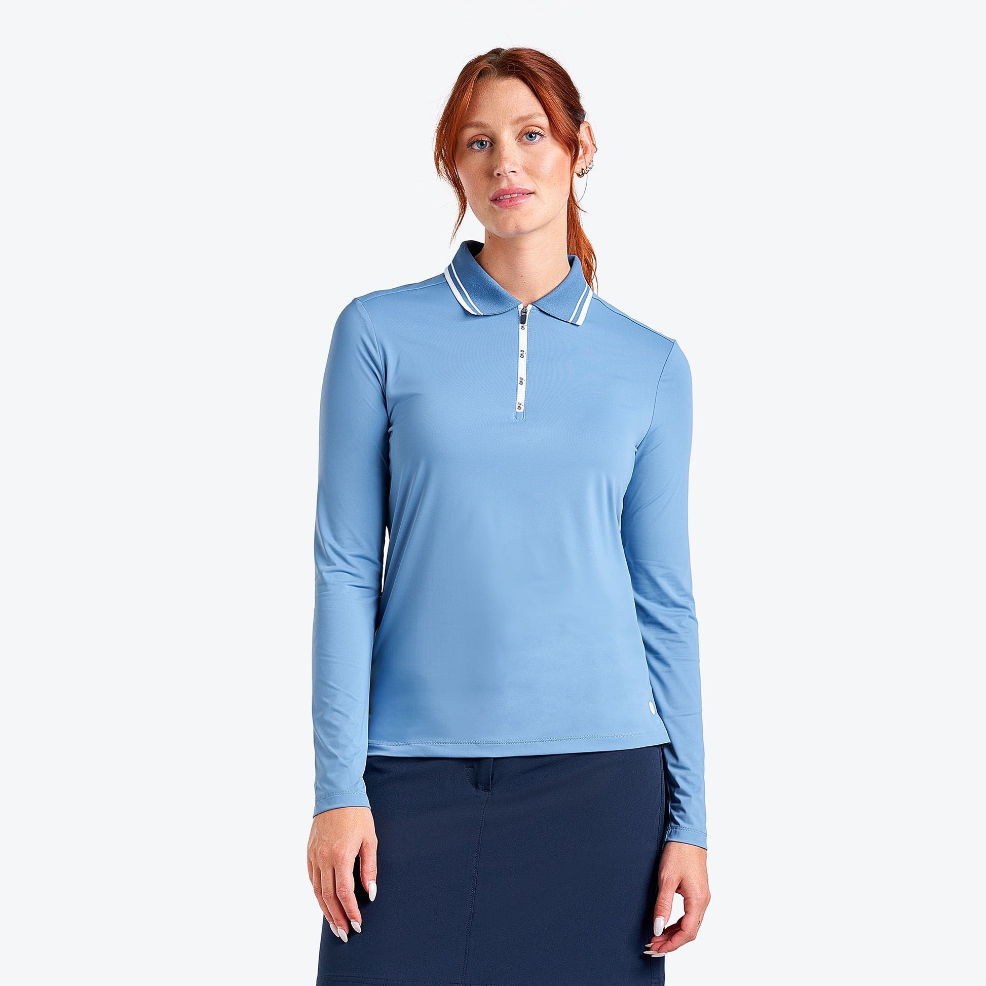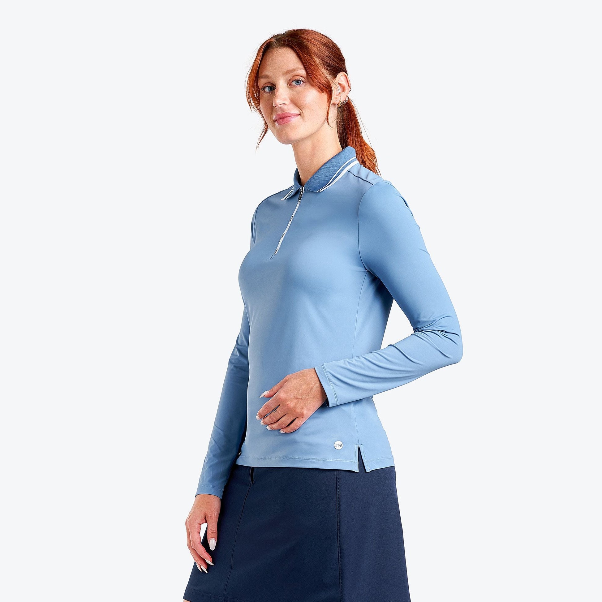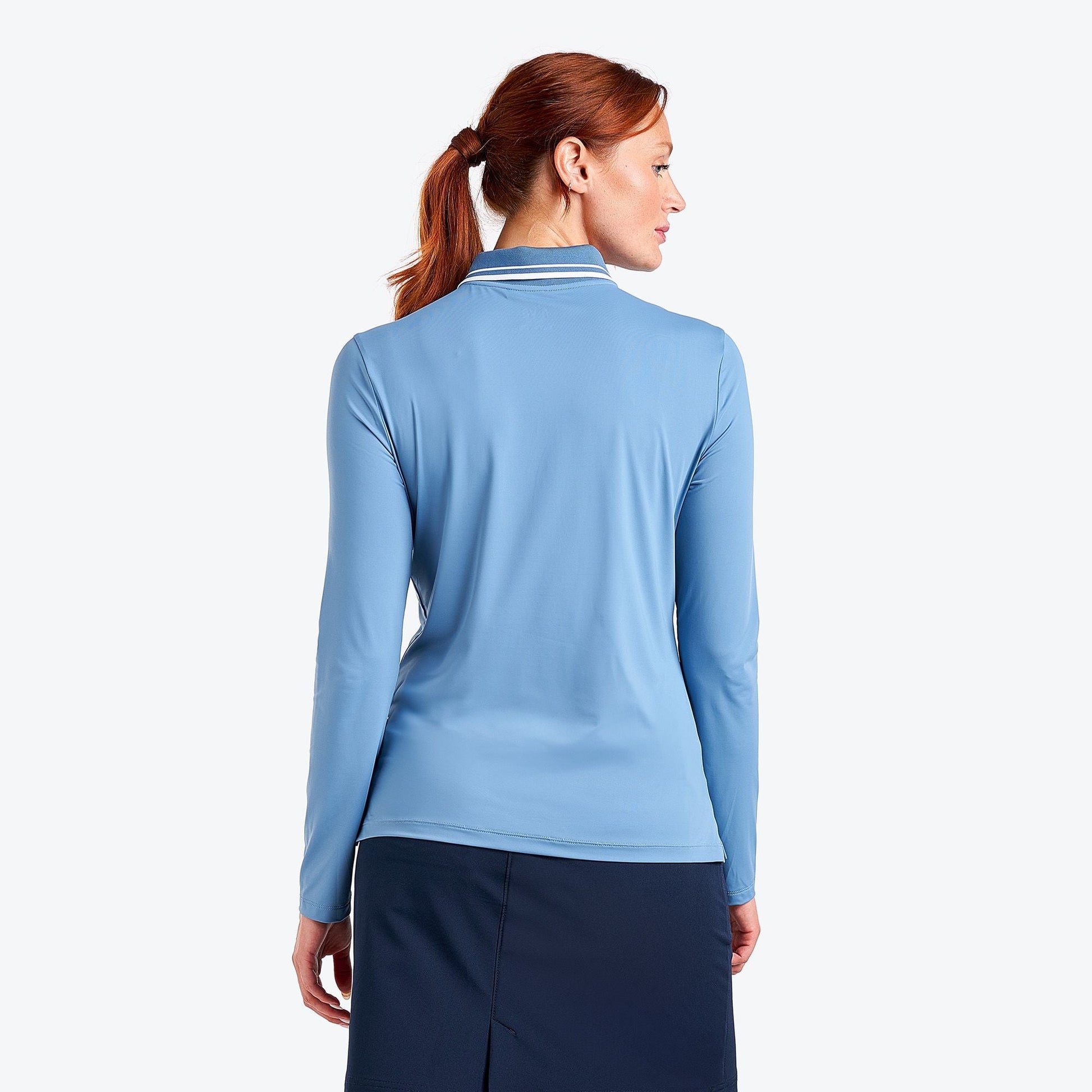 "The Alana polo shirt from NVO boasts stretchiness and a soft feel, thanks to its jersey fabric, ensuring exceptional comfort. This golf polo, with its long sleeves, keeps you warm while facilitating air circulation, providing a fresh feel through its cooling, moisture-wicking, and quick-drying properties.