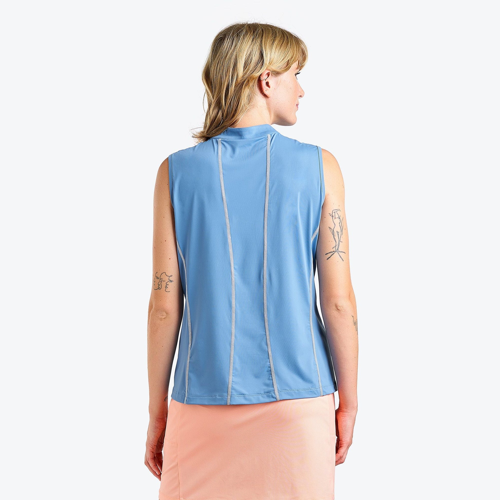 "This women’s golf mock from NVO is designed to keep you cool and its moisture-wicking properties ensure a comfortable experience even during your most intense rounds of golf. This model's fabric features 30+ sun protection properties, reducing the risk of UV exposure, providing both protection and comfort.
