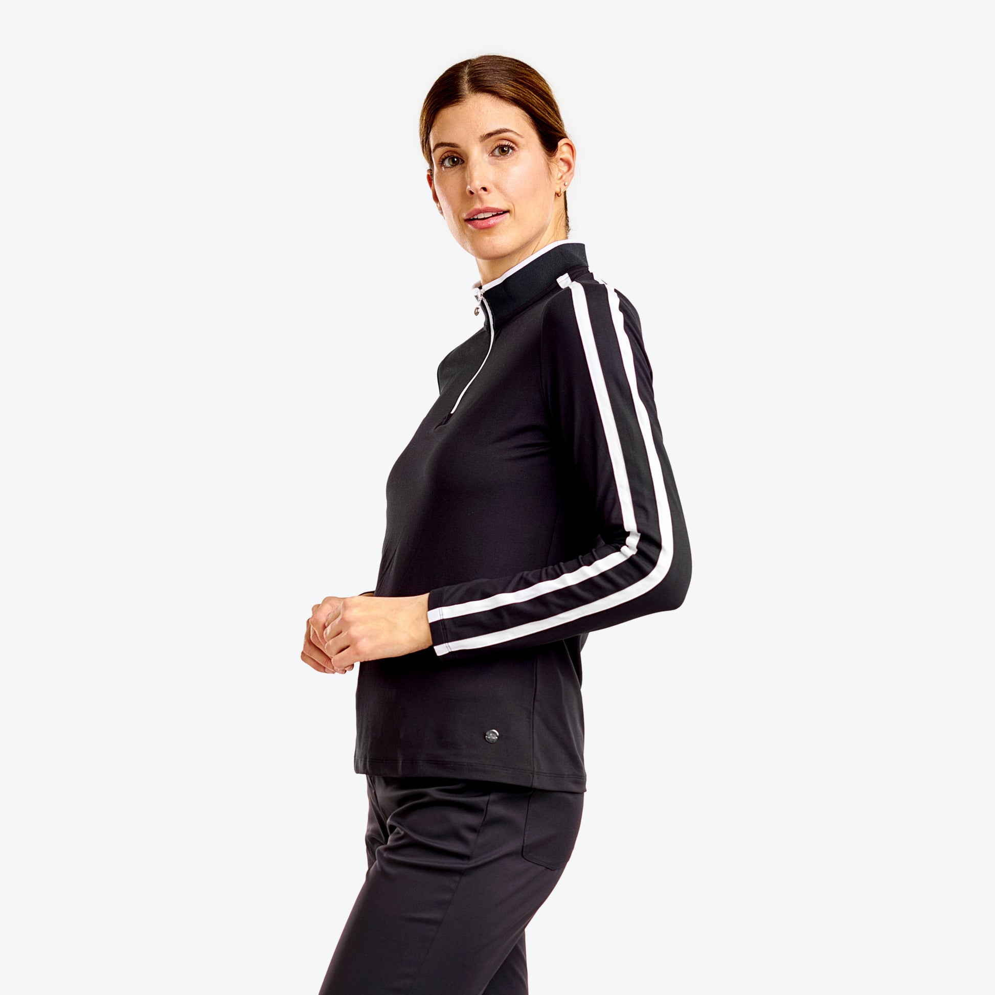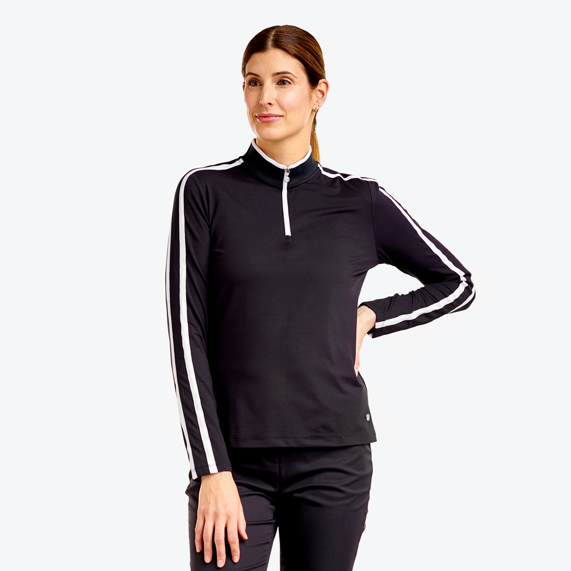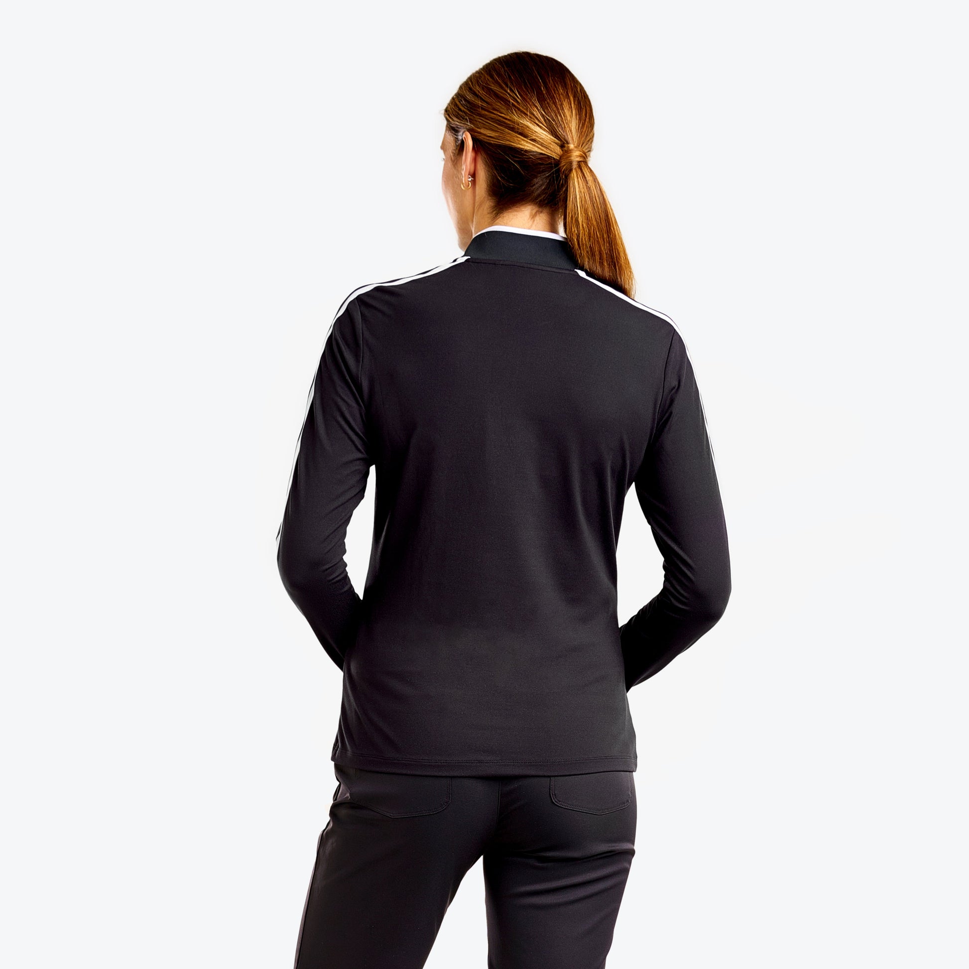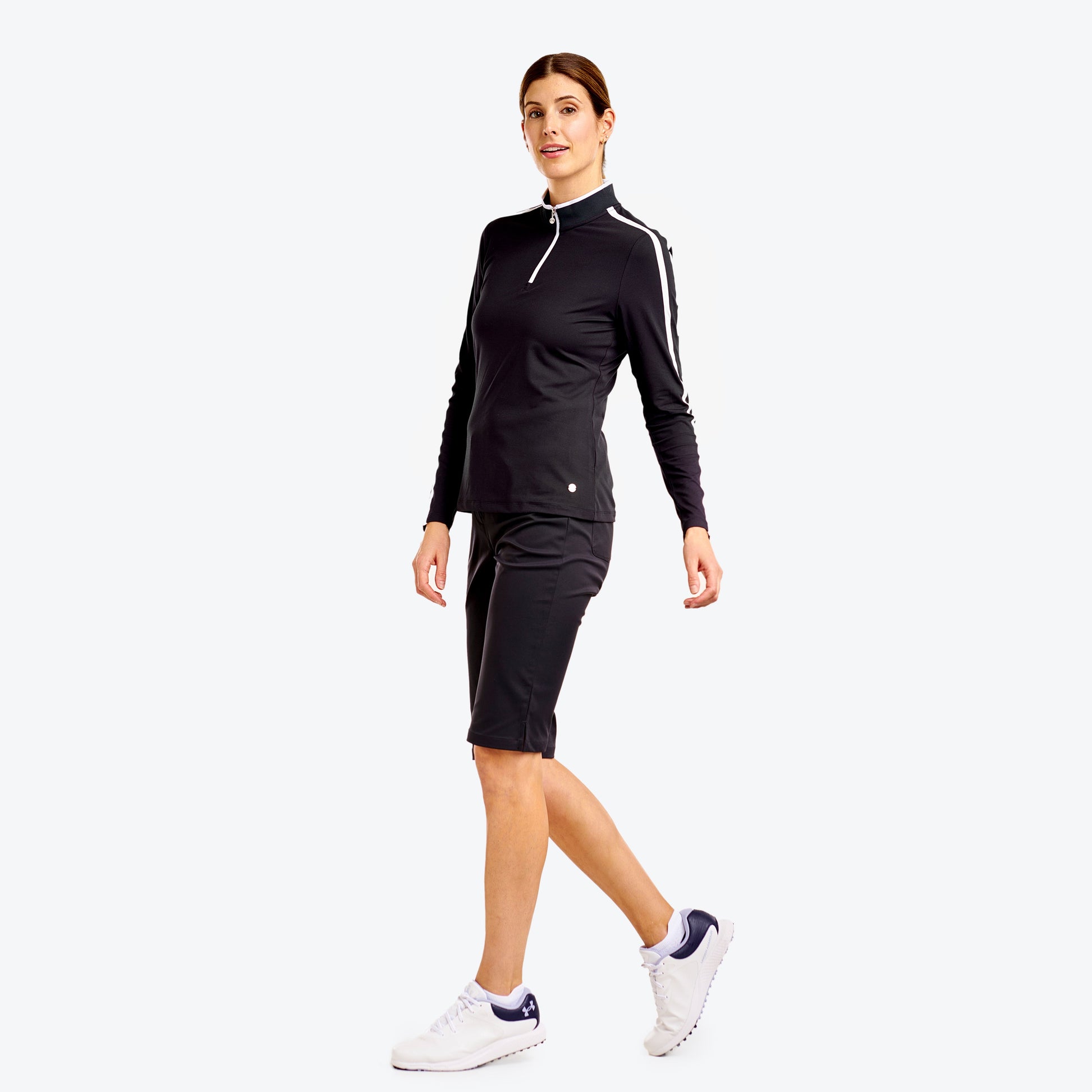 Combining comfort and performance, this long sleeve top is perfect for your golf rounds. Made with soft peached knit, it offers a semi-fitted cut and great freedom of movement. The yarn-dye rib collar and applied stripes on the shoulders and sleeves add a stylish touch, while its UV protection, quick-dry, and moisture-wicking properties ensure optimal comfort throughout your game.