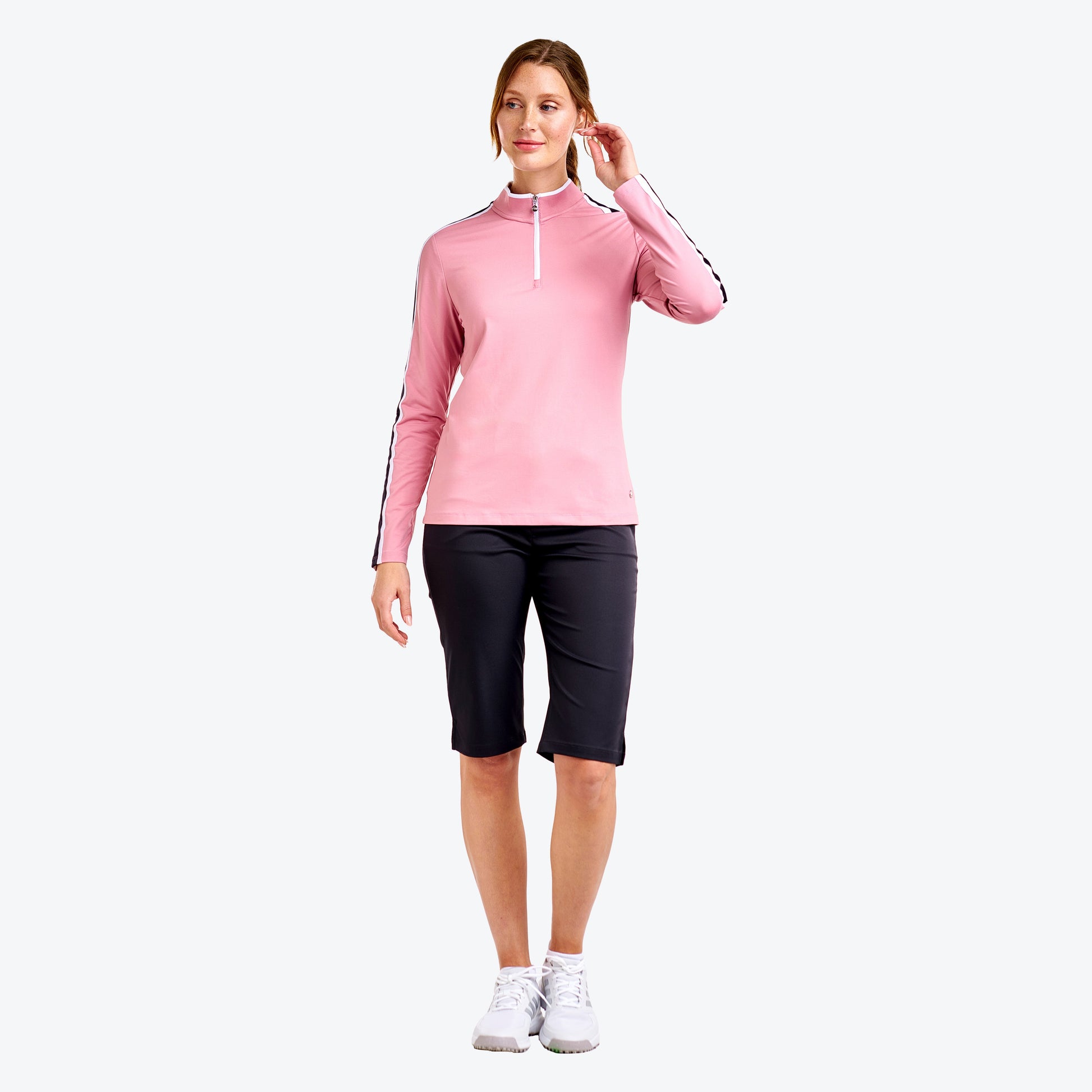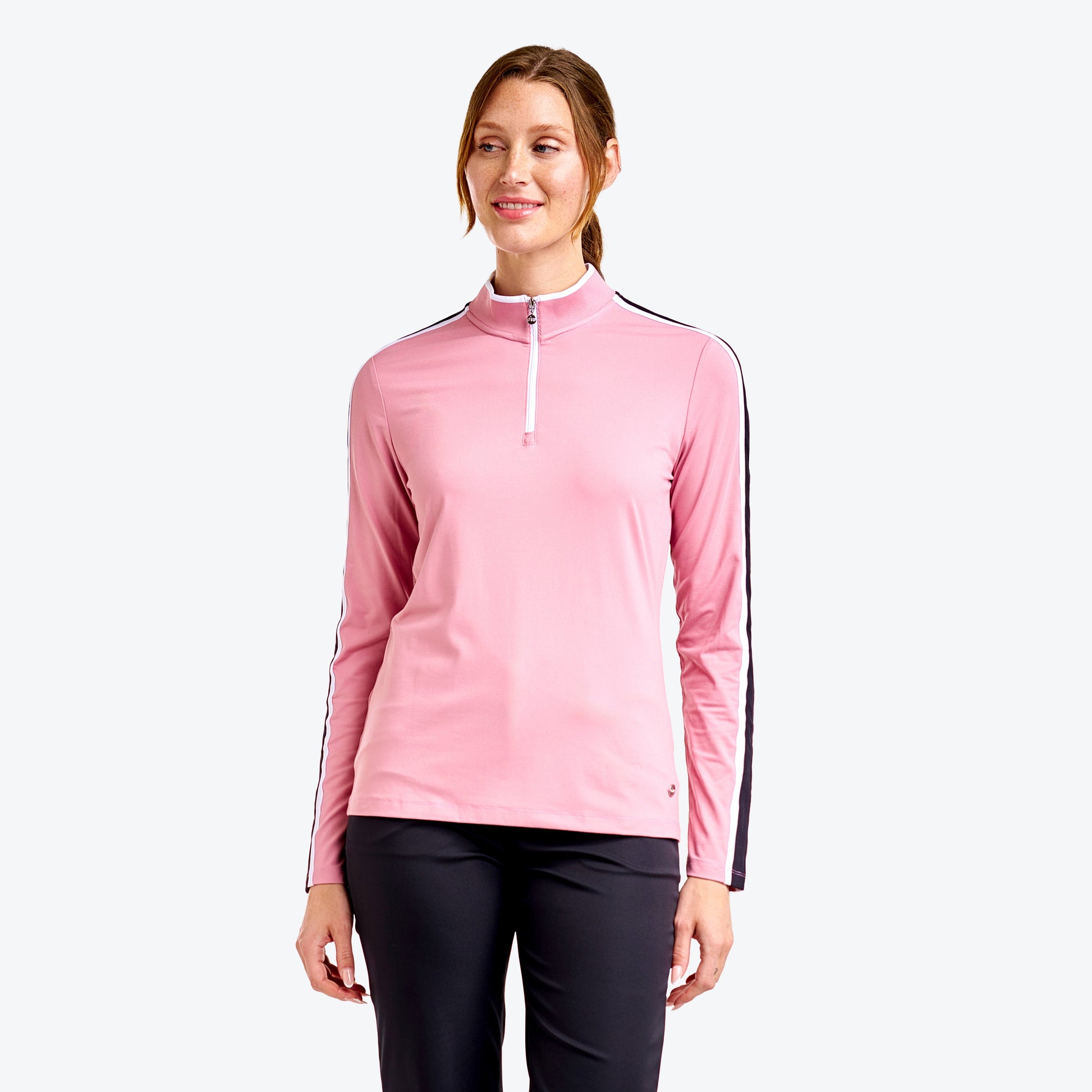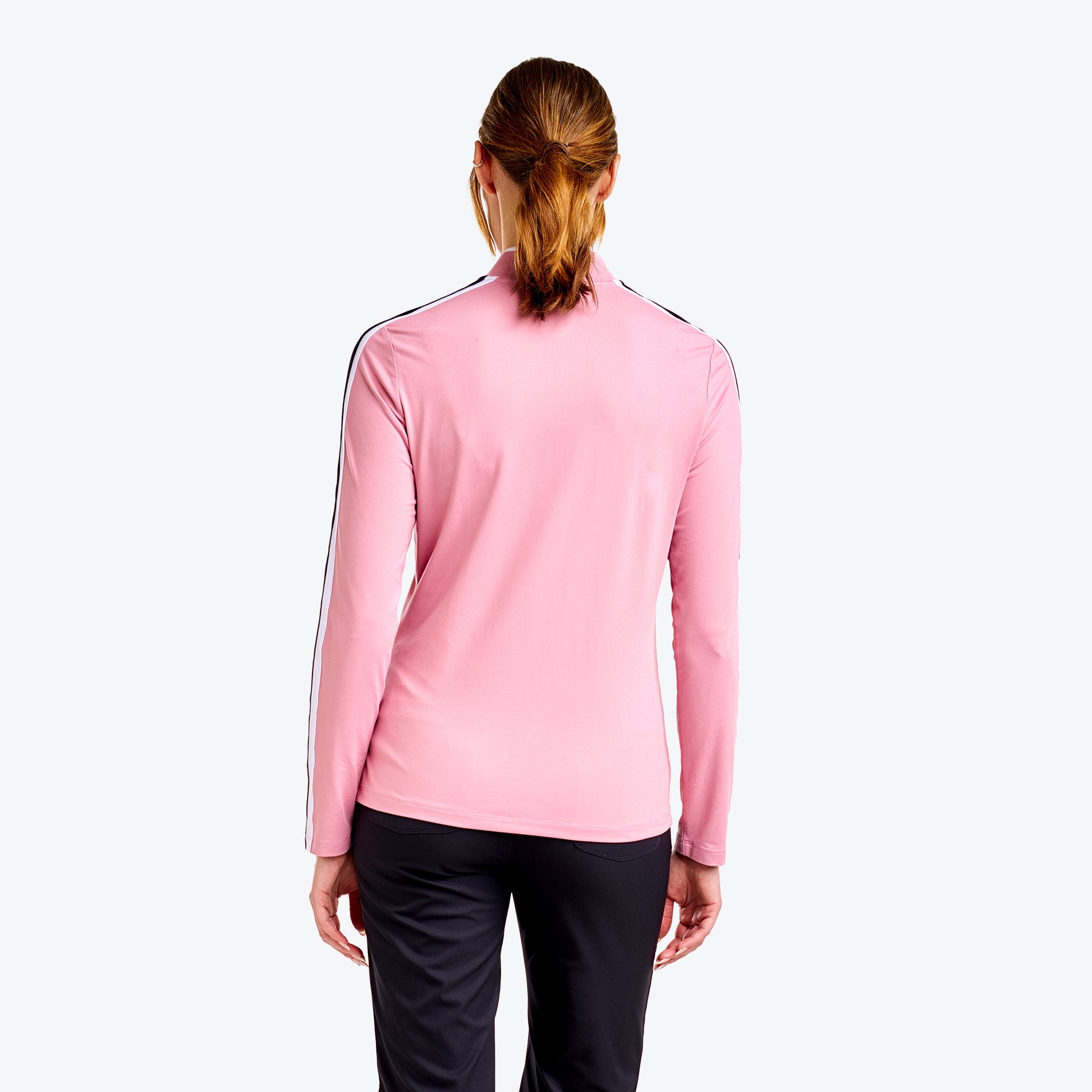 Combining comfort and performance, this long sleeve top is perfect for your golf rounds. Made with soft peached knit, it offers a semi-fitted cut and great freedom of movement. The yarn-dye rib collar and applied stripes on the shoulders and sleeves add a stylish touch, while its UV protection, quick-dry, and moisture-wicking properties ensure optimal comfort throughout your game.