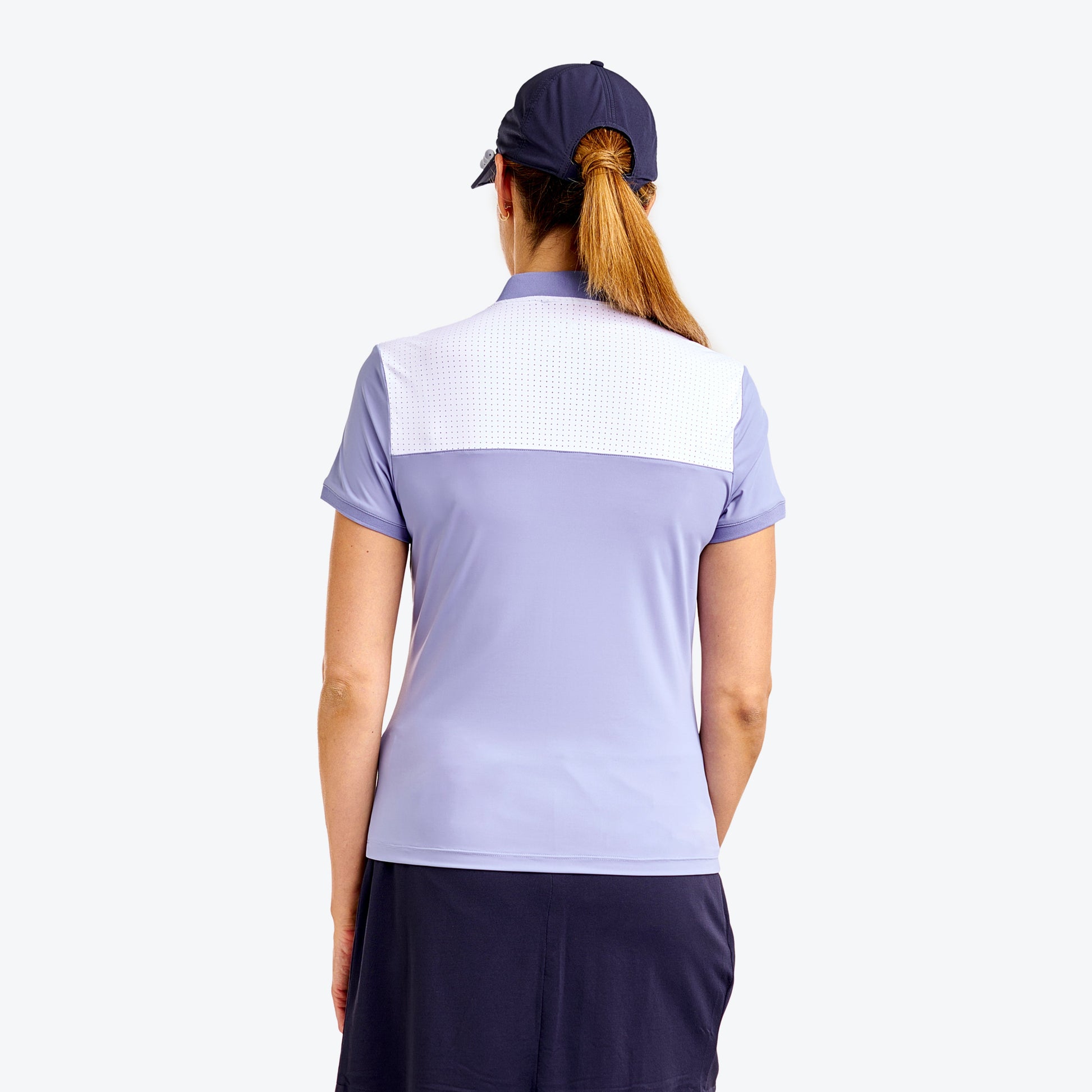 This short-sleeved golf top combines comfort and performance on the course. Its semi-fitted cut and laser-cut fabric on the front and back offer both elegance and breathability. The ribbed collar and cuffs, paired with a practical YKK zipper, add a modern touch. With UPF 40+ sun protection, quick-dry properties, and cooling effects, this top keeps you cool and dry even on the hottest days. The perfect choice for golfers.