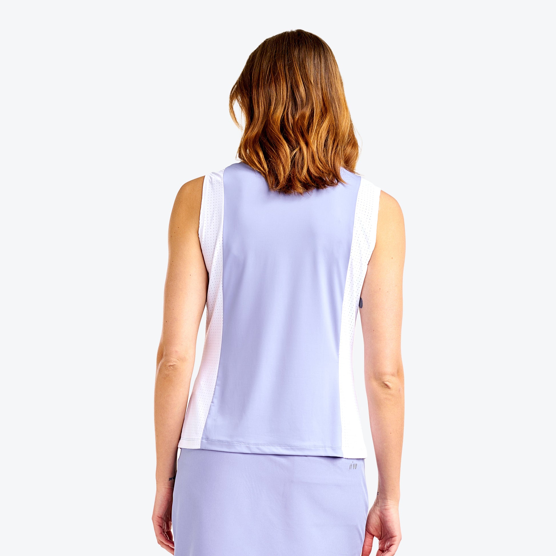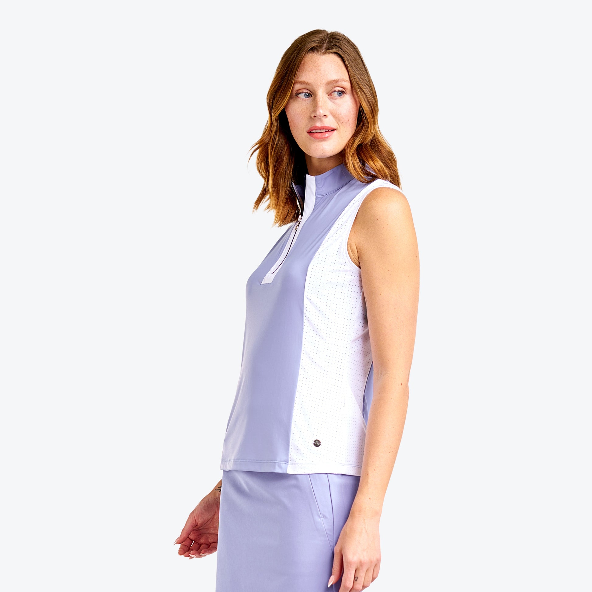 This sleeveless top is designed for golfers, combining comfort and performance with its mock neck and semi-fitted cut. The Emily mock offers UFP 50+ sun protection and quick-dry features, perfect for a day on the course. The YKK zipper and contrast details add a modern touch, while the laser-cut venting holes provide optimal breathability. Ideal for golf, this top keeps you cool and dry while you play. Made from smooth, ultra-stretchy fabric that dries quickly and keeps you cool, this sleeveless golf polo makes it easy to focus on your swing while looking fashionable while you play.