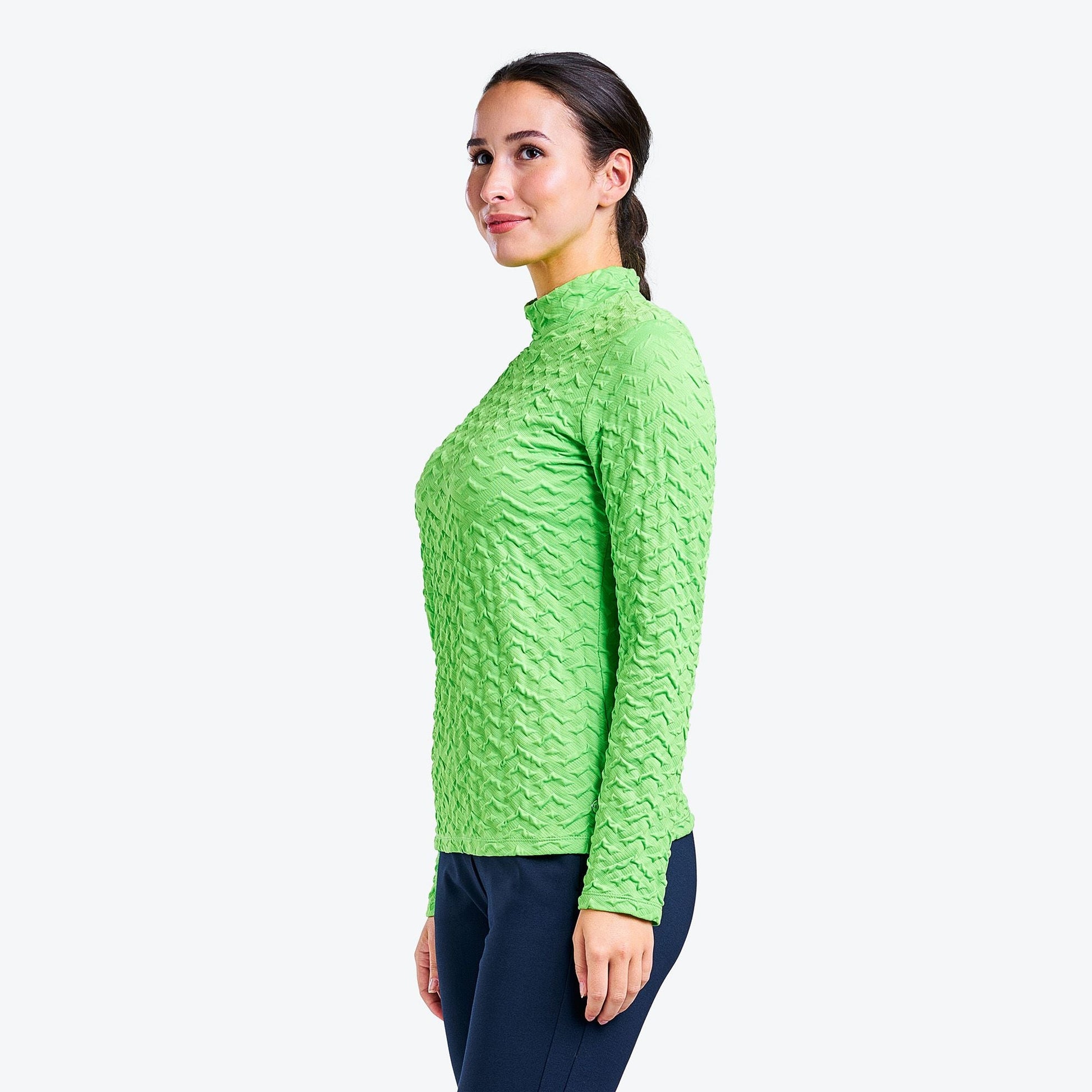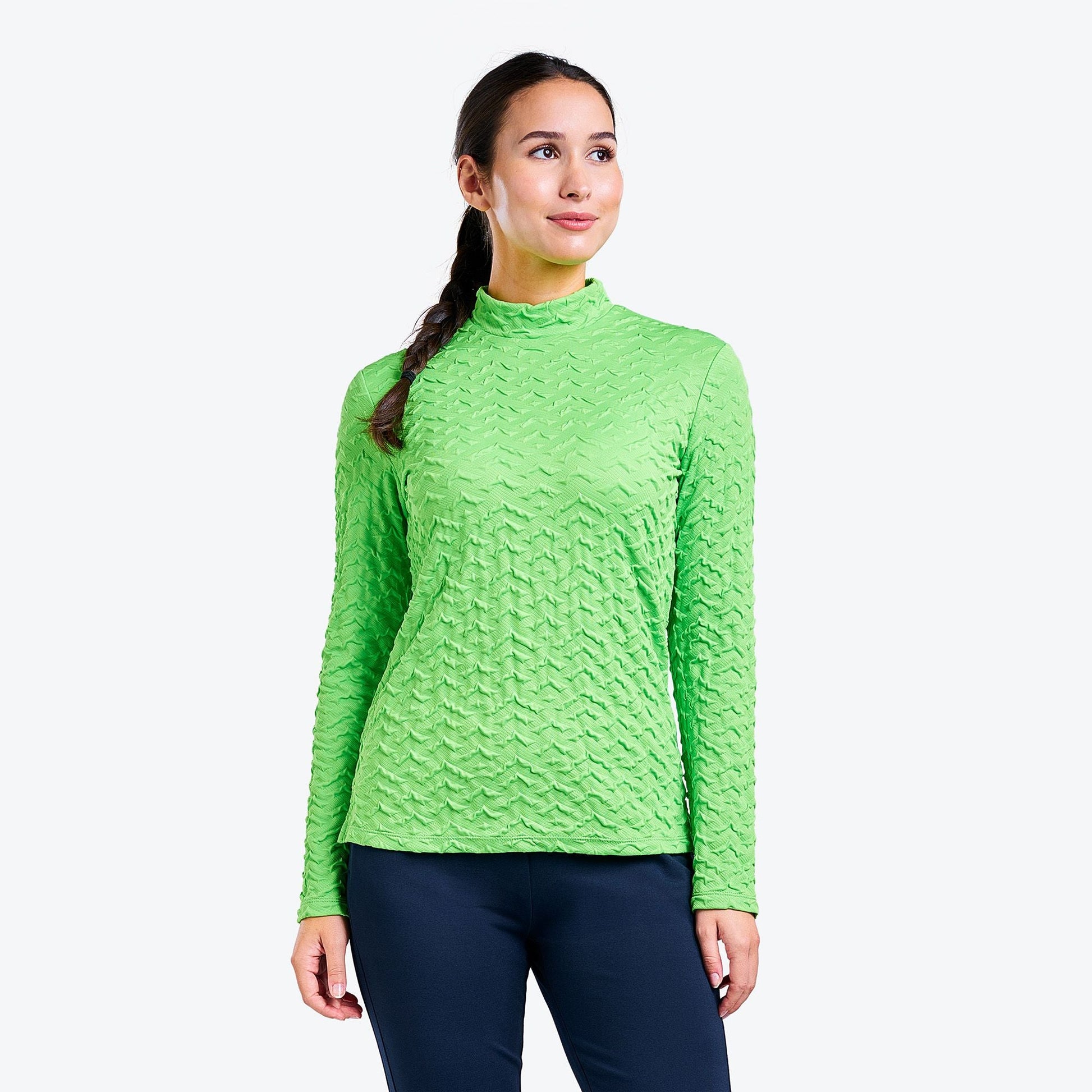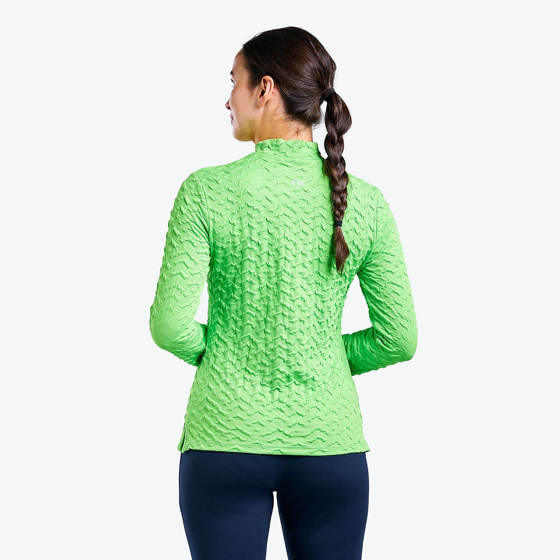 "Introducing the Mady golf mock from NVO. This long sleeve golf top is lightweight and comfortable. It features UPF 30+ properties protecting you from UV rays. It’s also quick-dry and moisture-wicking to ensure you stay dry and fresh, even on warmer days. Moreover, the 3D design makes it even more fashion. You can wear it either on the golf course or for everyday wear."